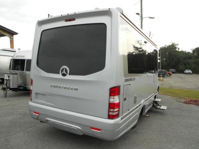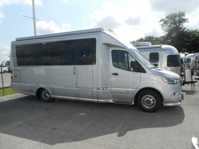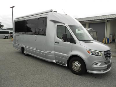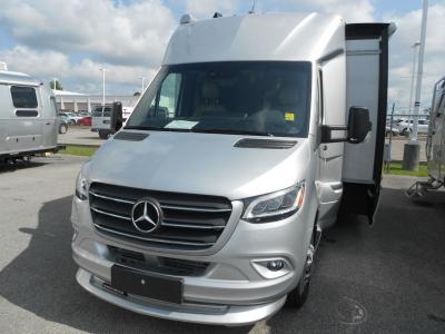 The coach is built on a Mercedes-Benz Sprinter van chassis, and includes active safety systems that automatically provide additional safety on the road such as active brake assist, driver attention assist, and active distance assist, distronic plus. The interior offers a cockpit with advanced in-dash technology and heated, swivel driver/passenger seats, plus the lavatory provides a stand-alone, corner shower with teak wall inlay, a Kohler faucet, shower head and sink, and a riveted aluminum porthole door.