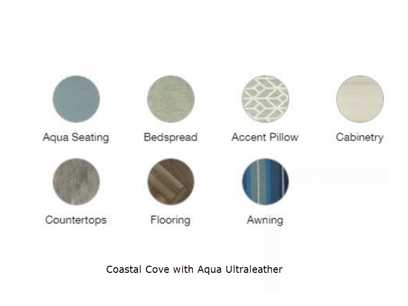Sleeps 4 Length 23 ft 11 in Ext Width 8 ft Ext Height 9 ft 7 in Int Height 6 ft 6 in Interior Color Coastal Cove with Aqua Ultraleather, Coastal Cove with Seashell Ultraleather Hitch Weight 500 lbs GVWR 6000 lbs Dry Weight 5100 lbs Cargo Capacity 900 lbs Fresh Water Capacity 37 gals Grey Water Capacity 37 gals Black Water Capacity 17 gals Tire Size ST225/75R15 Furnace BTU 18000 btu Available Beds RV Queen Refrigerator Type 12V Electric w/Freezer Refrigerator Size 6.8 cu ft Cooktop Burners 3 Number of Awnings 1 LP Tank Capacity 30 lbs Water Heater Type Tankless On Demand LP AC BTU 13500 btu TV Info LR 24" 12V DC Smart TV, BR 24" 12V DC Smart TV Awning Info Powered Zipdee with Sunbrella Fabric; Rear & Roadside Window Awnings Axle Count 2 Number of LP Tanks 2 Shower Type Standard Electrical Service 30 amp Similar Floorplans
